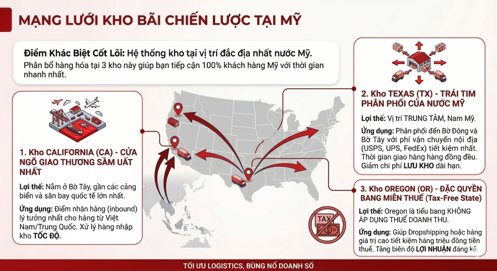 - Ứng dụng: Đây là “vũ khí bí mật” giúp các doanh nghiệp Dropshipping hoặc các mặt hàng giá trị cao tiết kiệm hàng triệu đồng tiền thuế cho mỗi lô hàng. Chuyển hướng lưu kho và xử lý đơn tại Oregon giúp biên độ lợi nhuận của bạn tăng lên đáng kể.